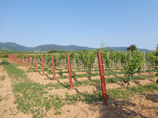 Dieses Jahr haben wir, aufgrund der Flurbereinigung in Kirrweiler, ca. 8000 neue Reben angepflanzt. Flurbereinigung bedeutet, dass in einem abgegrenzten Gebiet alle Weinberge zunächst enstockt werden. Im Anschluss werden die vielen kleinen Parzellen eines jeden Betriebes zusammengelegt, sodass im idealfall ein großer Weinberg entsteht. Dies dient insbesondere der besseren Mechanisierbarkeit sowie der wirtschaftlicheren Bewirtschaftung der einzelnen Parzellen. Gepflanzt wurden die Rebsorten Riesling, Grauburgunder und Sauvingnac, eine neue pilzwiderstandsfähige Weißweinsorte. Die Pflanzung der Reben erfolgte Anfang Mai maschinell. Im Anschluss wurden die Metallstickel gestellt und ein Draht zur Befestigung der Pflanzstäbchen gezogen. Alle Reben wurden bis auf einen verbleibenden Trieb ausgebrochen. Dieser wird nun mit einer Bindezange am Stäbchen mehrmals befestigt und im Idealfall erreichen die Triebe bis Ende des Sommers eine Gesamtlänge zwischen 1,5 m - 2 m. Leider haben wir aktuell jedoch mit extremer Trockenheit zu kämpfen und müssen nun die jungen Reben bewässern, da die Wurzeln noch nicht tief genug sind. Wir hoffen auf baldigen Regen, damit sich die Situation etwas enstpannt und die ganze Mühe sich auch lohnt!